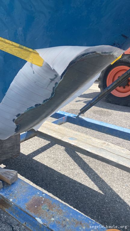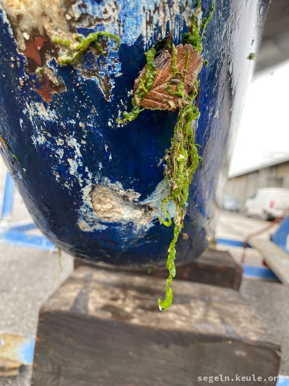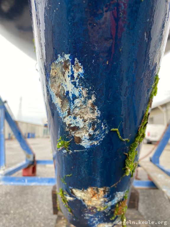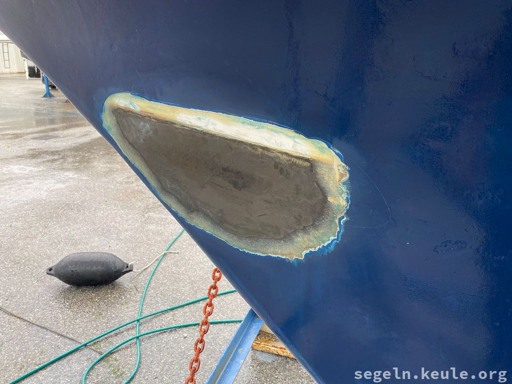 Nach dem Rauskranen der sailing.sam, sah man die wirklichen Schäden die bei der Grundberührung passiert sind.