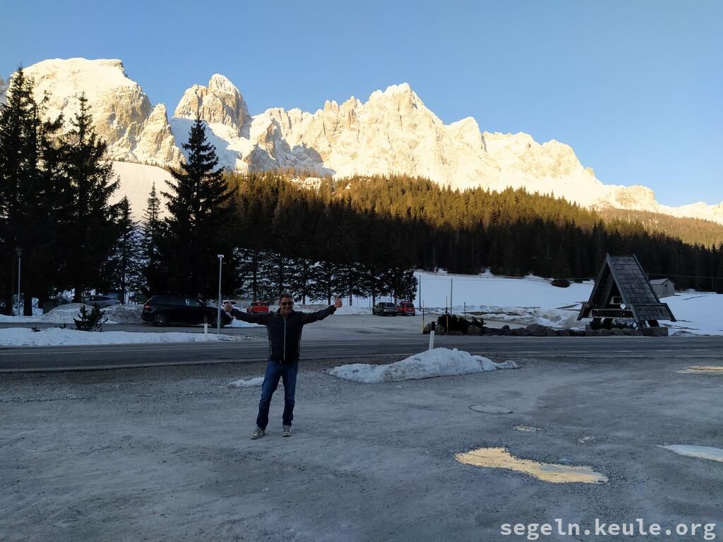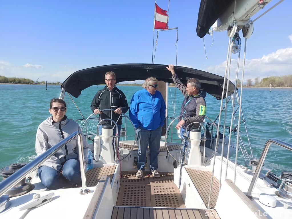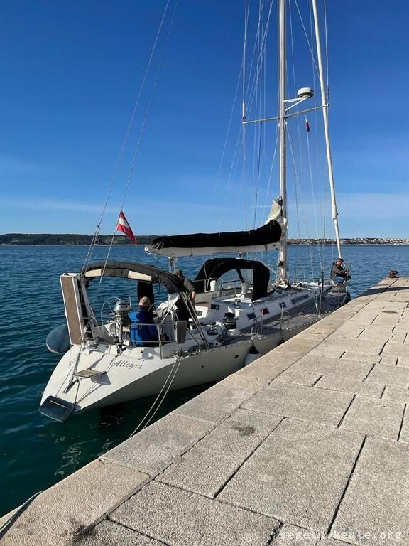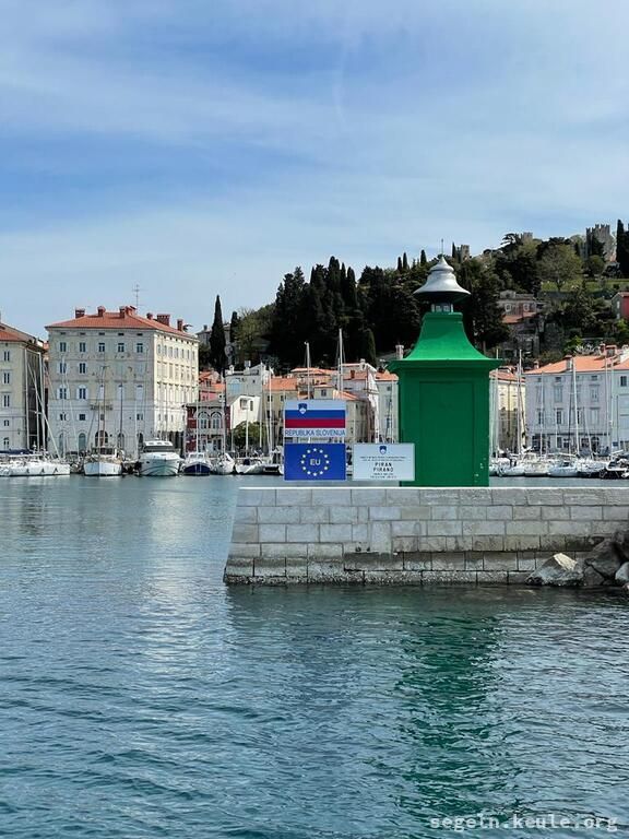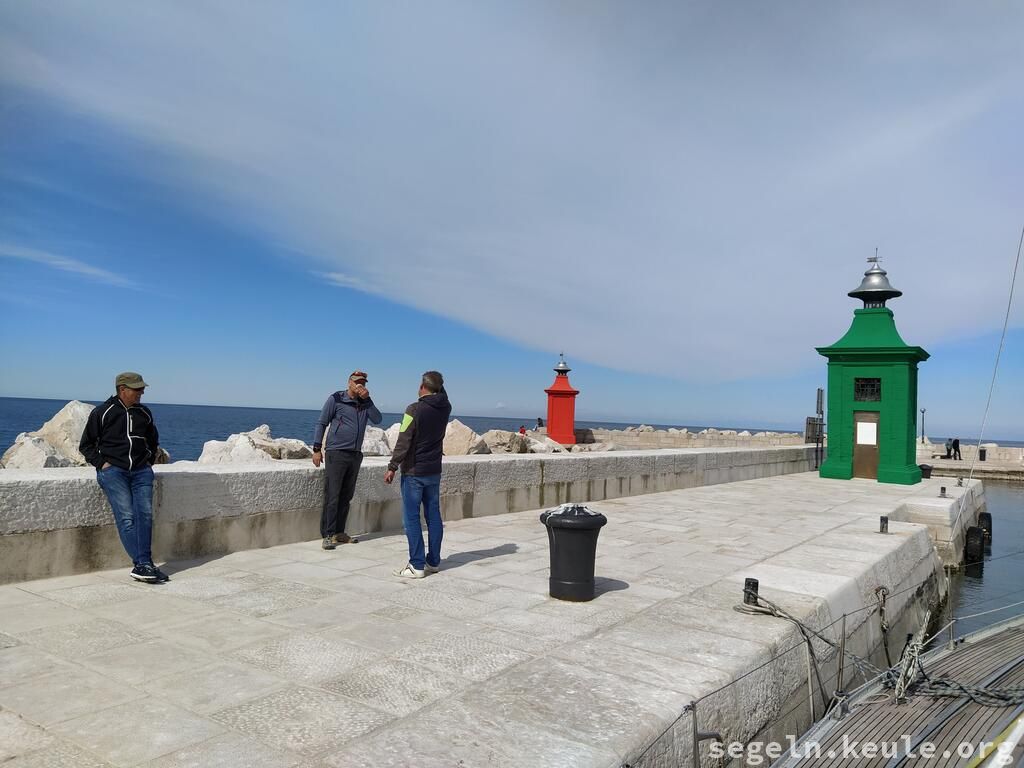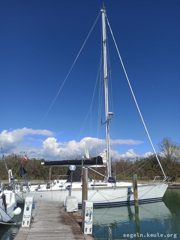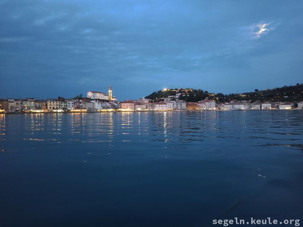 Die Anfahrt verlief mit Josef durch den Brenner, Südtirol und Sexten. Wir waren schon recht früh in Grado und warteten dort auf die anderen. Nachdem wir das Boot eingeräumt hatten, legten wir gegen 16:00 Uhr ab, mit Kurs auf Slowenien/Bernardin. Unterwegs konnten wir gut am Wind segeln und kamen gegen 19:00 Uhr an. Der Steg gehört zu dem Wellnesshotel dort, die Segelschule hat da irgend eine Abmachung, dass wir da liegen dürfen. Abends gingen wir noch ein wenig spazieren.