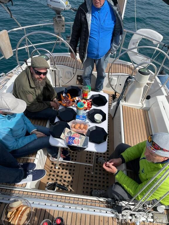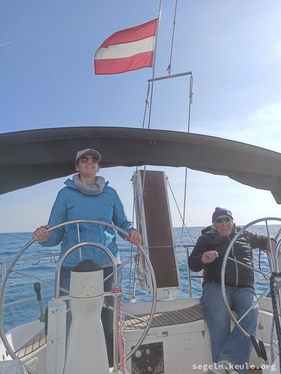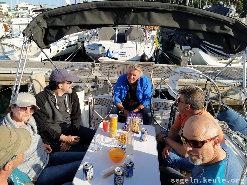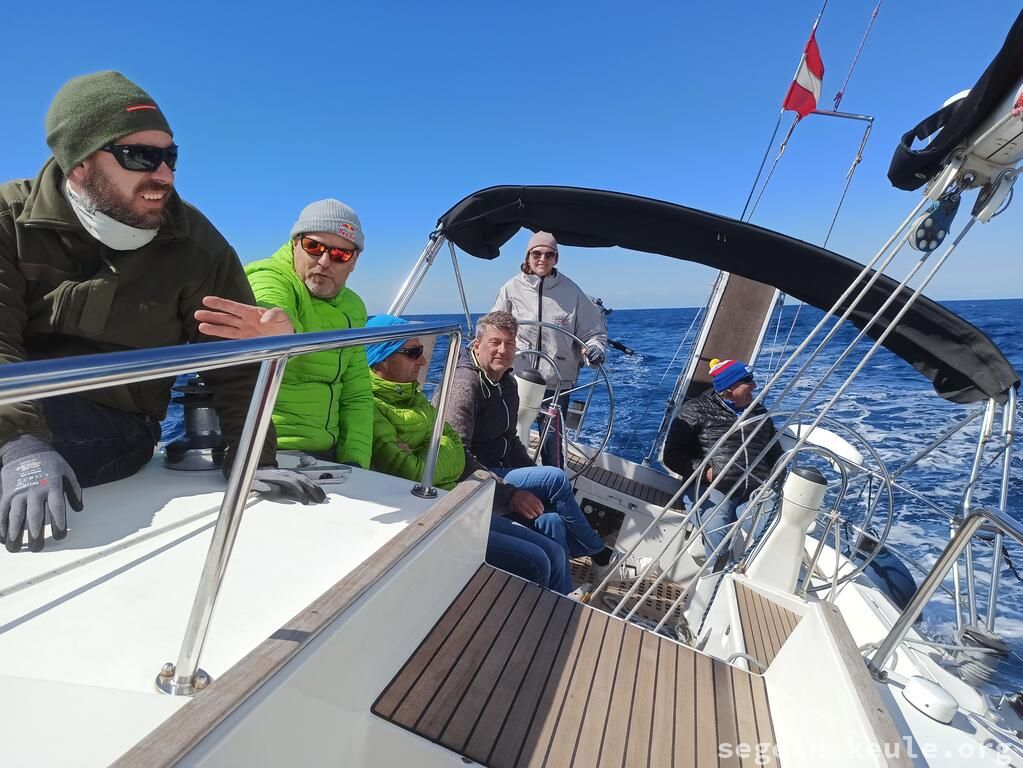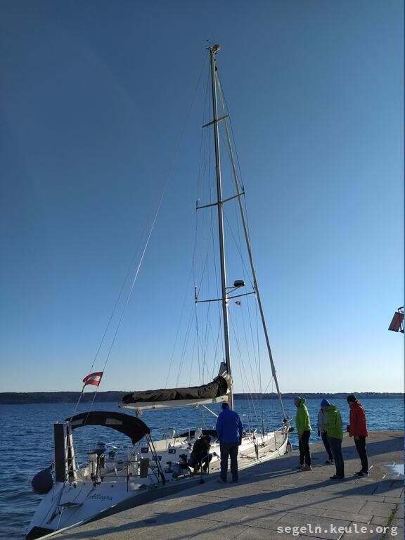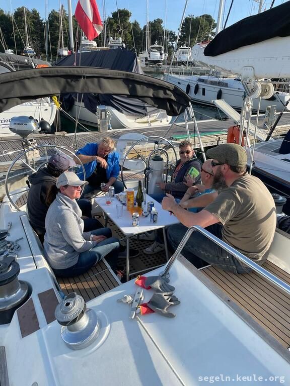 Am Morgen haben wir zwei Stunden lang Hafenmanöver geübt, danach ging es wieder an die Manöverkreise. Bei raumem Wind konnten wir dann gemütlich Mittagessen an Bord genießen. Später segelten wir bei halbem Wind in Richtung Novigrad und nutzten die Gelegenheit, um weitere Manöver, hauptsächlich "Boje über Board", zu üben. Gegen 17:15 legten wir schließlich mit dem Heck und den Mooringleinen im Hafen an.