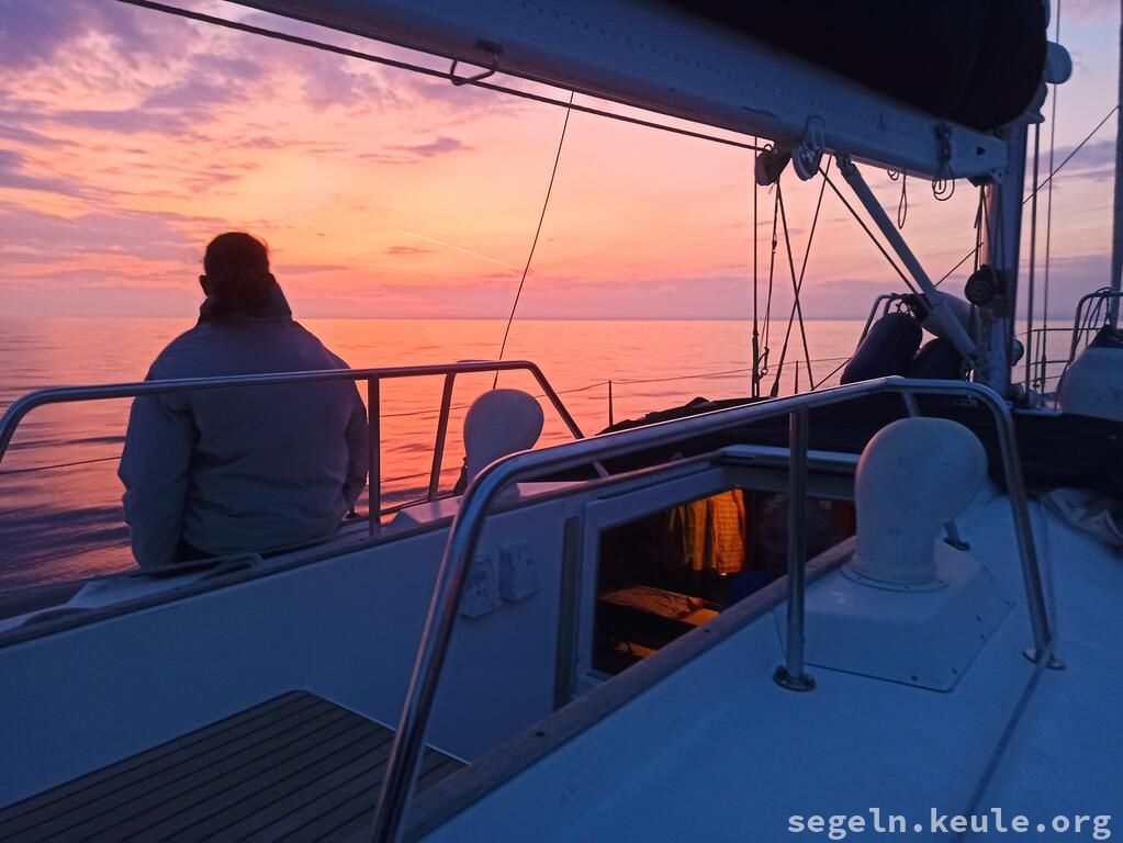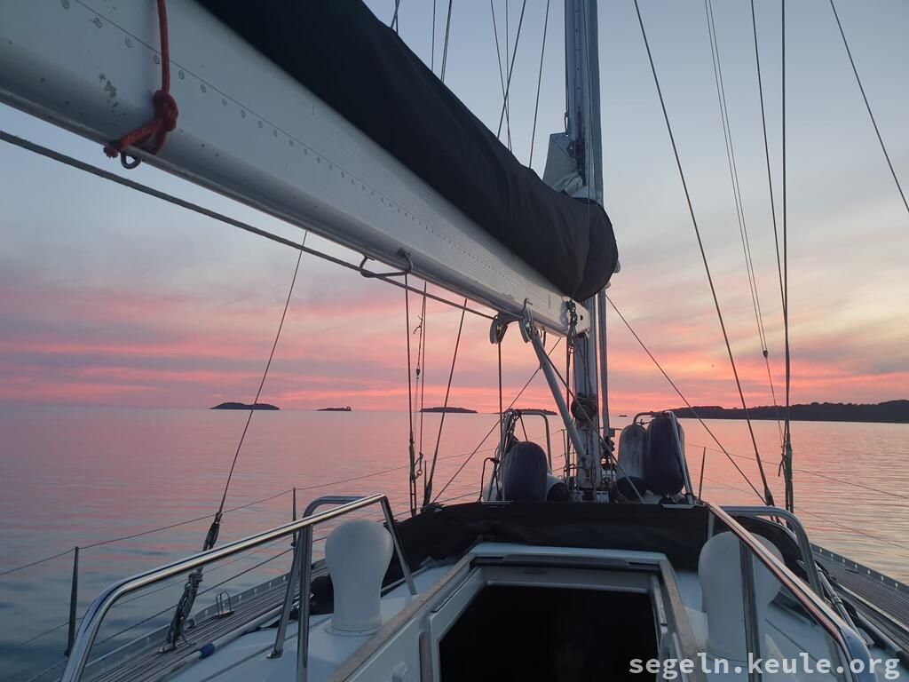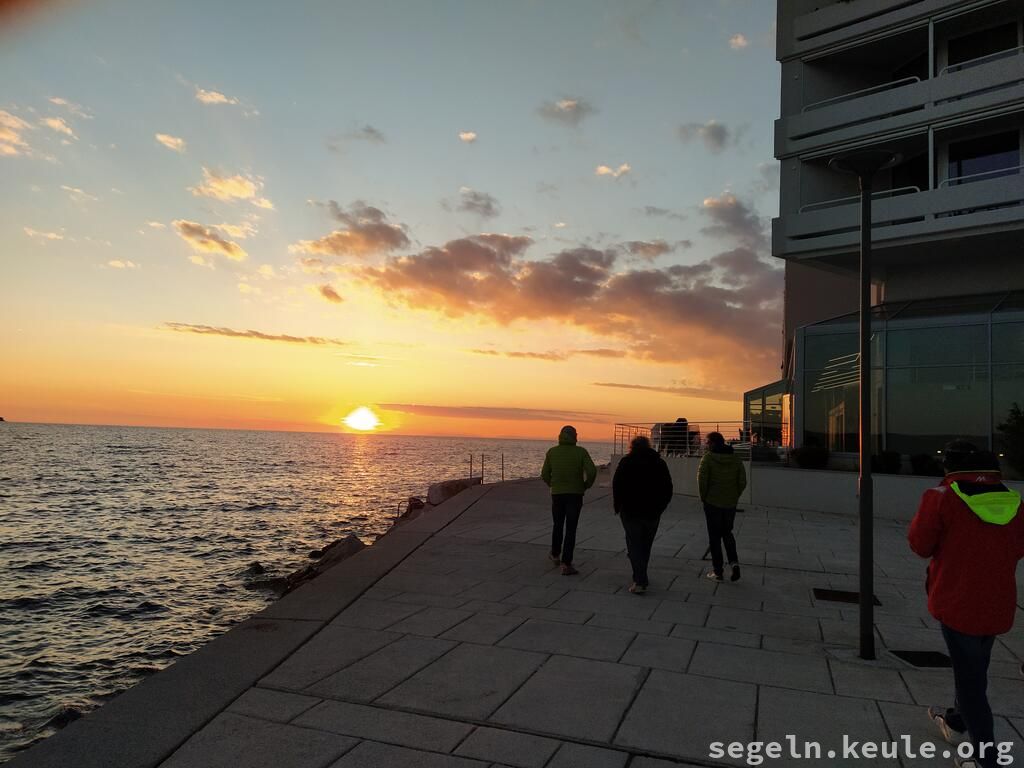In der früh tranken wir noch einen Kaffe und ich freundete mich mit einen kleinen Kater an. Der Segeltag begann um 10:00 Uhr mit Hafenmanövern. Getankt wurde im Umag auch noch. Da es unser letzter Tag war, mussten wir wieder einklarieren, was wir in Piran erledigten. Unterwegs wiederholten wir Manöverkreise und das Reffen der Segel. Einige von uns benötigten noch eine Nachtfahrt für die Prüfung, also warteten wir in Bernardin den Sonnenuntergang ab. In der Zwischenzeit erledigten wir noch die Boardkassenabrechnung, mancher war überrascht wie komfortabel diese Aufgabe von der App Splitweise erledigt wurde. Danach ging es los, wir steuerten verschiedene Häfen an und fuhren schließlich nach Italien, wo wir gegen 23:30 Uhr in unserem Heimathafen nahe Grado einliefen.