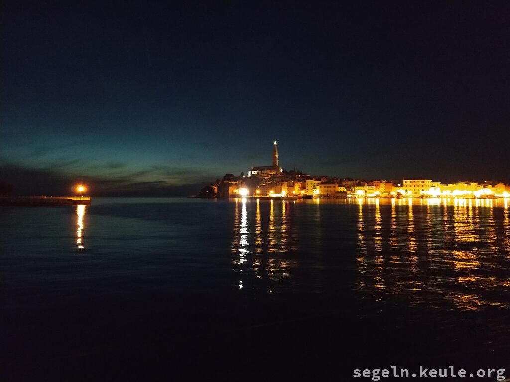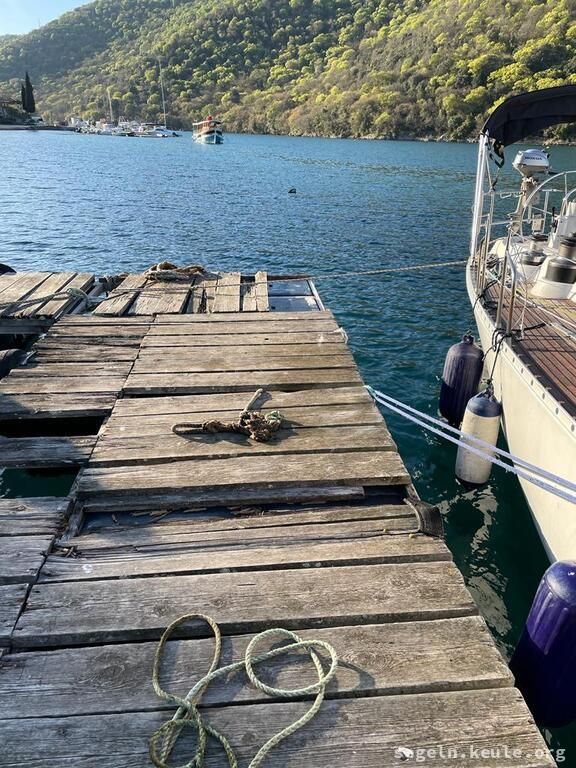 Während der Nachtfahrt steuerten wir verschiedene Häfen an, um das Navigieren im Dunkeln zu üben. Die Herausforderung bestand darin, die grün-roten Hafenleuchten in der Menge der Lichter zu erkennen und Entfernungen sowie Geschwindigkeiten richtig einzuschätzen. Besonders spannend wurde es im Limsky-Kanal, wo uns nur ein schmaler Fahrweg zur Verfügung stand, da an den Seiten viele Fischerräusen ausgelegt waren. Schließlich legten wir an einem verfallenen Steg an, da der eigentliche Hafen bereits voll belegt war. Am nächsten Tag sahen wir erst wie verfallen das Teil war!